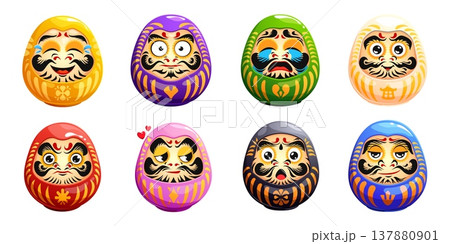 Funny japanese daruma dolls, traditional art of Japan, vector mascots of luck and success. Cartoon round color dolls with funny faces and emotions. Japanese daruma toys, Bodhidharma wishing charms set