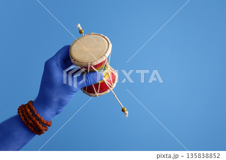 Maha Shivratri. Blue Lord Shiva hand holding damaru with rudraksha mala