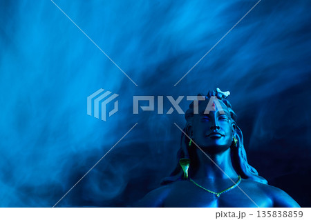 Maha Shivratri background. Lord shiva statue meditating in blue smoke light