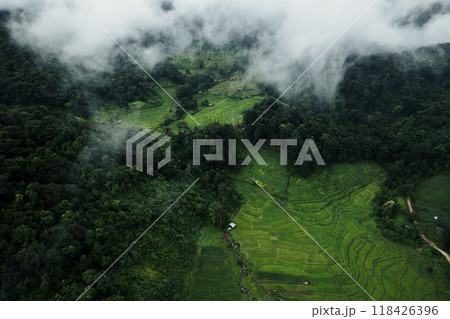 Aerial view of the rice fields In the rainy season