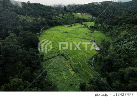 Aerial view of the rice fields,Rice fields and mountains in the early morning