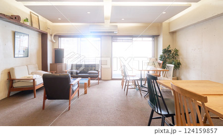 明るい光が差し込むカフェスペースの内観 インテリア イメージ