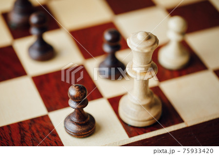 Chess board with figures. Wooden chess. Board games. Location of opponents. Counter strategy. Queen