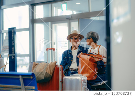 フェリーターミナルで出発を待つシニア夫婦の旅行シーン