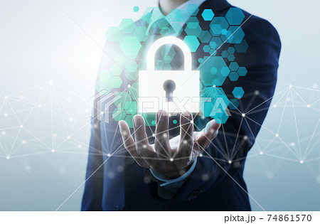 サイバーセキュリティとデータ保護。盾と鍵のアイコンを持つ男性。