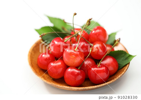 白バックに葉を添えて木の皿に盛ったさくらんぼ