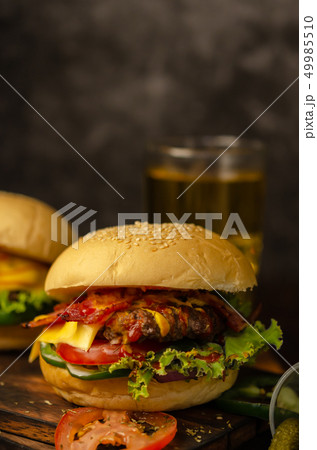 Delicious tasty burger with beef cutlet, fresh vegetables and cheese