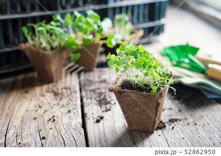 Corn salad or lamb's lettuce in an egg tray on the wooden table, sustainable home gardening and connecting with nature concept