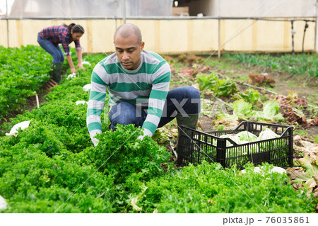 Latin american farmer in a greenhouse harvests lettuce leaves in the garden.