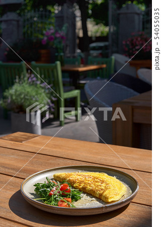 Breakfast. Omelet with tomatoes, arugula, cheese on a blue plate. Frittata - Italian omelette.