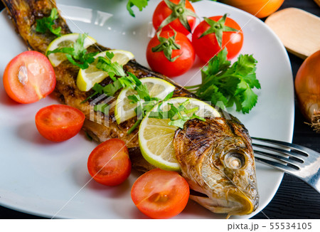 Dish Dorado with arugula and lemon. BBQ seafood. Restaurant menu. Variety of dishes on the table