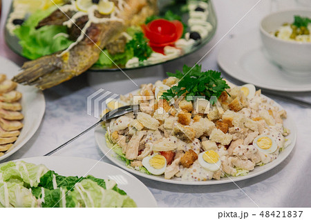 Plates seafood BBQ with garnish. Variety of dishes on the table. Restaurant menu.