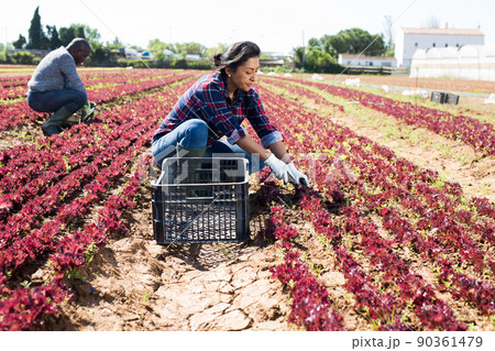 Lettuce oakleaf green bio harvest farm field Lactuca sativa harvesting food corrugated farmer farming greenhouse closeup garden leaf plant green row leaves greenhouse organic plantation vegetables