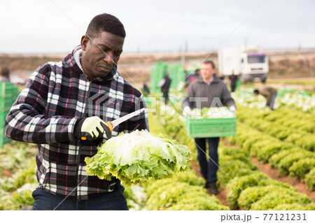 Female worker sorting and preparing lettuce for packaging at factory, workers on background