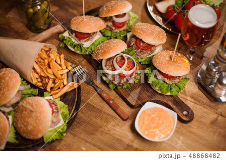 Beef burgers with fries nd a refreshing glass of ice beer on a restaurant table