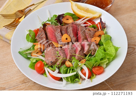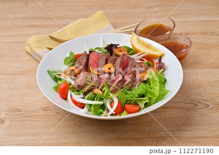 ボリューミーなステーキサラダ、野菜サラダ、牛モモ肉のステーキ、ドレッシング添え。