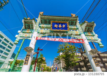 日本の横浜都市景観 5月。横浜中華街・朝陽門やヨコハマベイサイドブルーなどを望む=22日