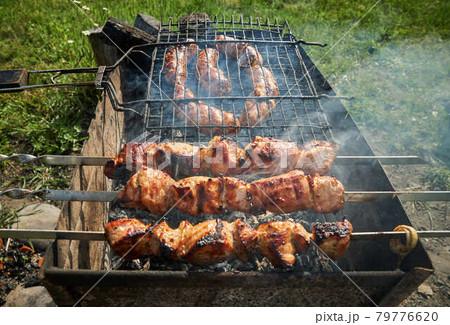 Barbeque meat and sausages or bratwurst on a grill grate in backyard. Man preparing shashlik or shish kebab over charcoal. Grilled meat on metal skewer outdoor. BBQ party or picnic food. Close up shot