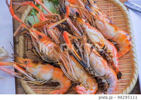Grilled Big River Prawn Placed on a bamboo plate.