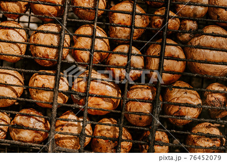 mushrooms champignons stacked in a barbecue on the grill