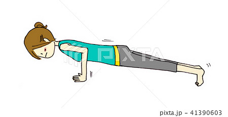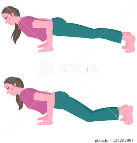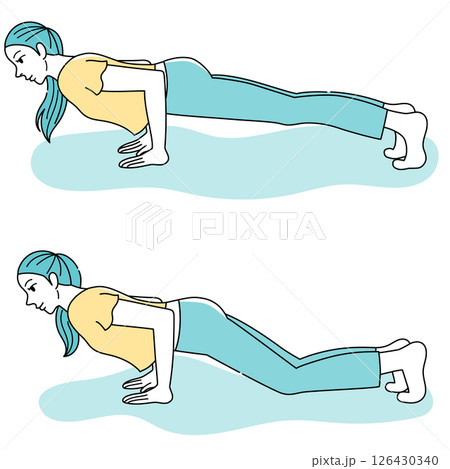 ヨガの四肢で支える杖のポーズをする女性(膝を上げたポーズと膝をついたポーズの2種セット)