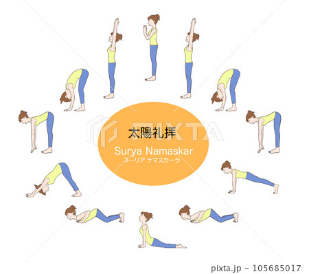 ヨガ、太陽礼拝のポーズをする女性のセット