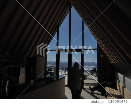 冬の白馬岩岳スノーフィールド 白馬ヒトトキノモリに建つチャバティ白馬の茶店内から窓外の眺め