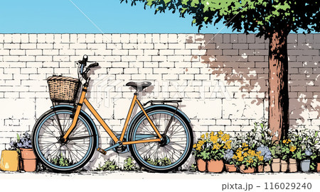 快晴の日差しの下で、白い壁の脇に放置されたママチャリ
