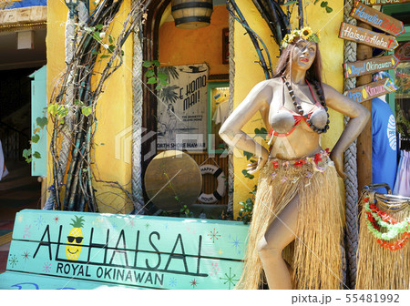 北谷町のアメリカンビレッジに立つ藁のドレスとココナッツのブラジャーを着てる人形