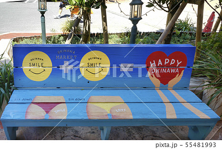 北谷町のアメリカンビレッジにある可愛いストリートアートを飾った黄色いベンチ。