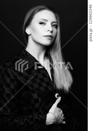 Beautiful woman with checkered suit black and white studio portrait