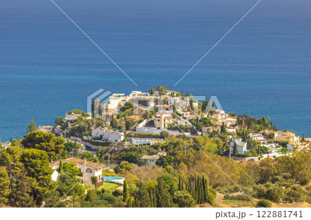 Coastal hillside homes overlooking the ocean. Luxury villas nestled amongst lush greenery and a stunning blue sea.