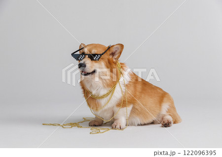 Stylish corgi dog with pixel glasses and gold chains, radiating charm and coolness