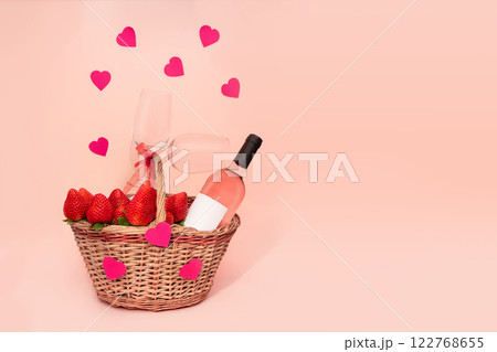 Romantic strawberry and rose wine basket with two glasses and hearts on pink background with copy space.