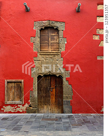 Cannons guarding vibrant red facade with rustic wooden doors and windows in tenerife