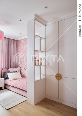 An Elegant and Modern Bedroom Featuring Stylish Decor Along with Unique Shelving Solutions