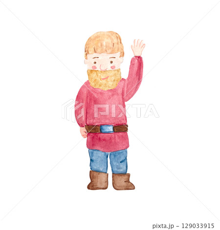 Bearded man in red tunic, blue pants, brown boots, raising his hand in friendly greeting. Cute watercolor illustration isolated on white. Ideal for children books, storytelling, folk-themed projects