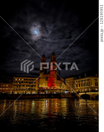 Zurich Switzerland night panorama city skyline at Limmat River with Fraumunster Church