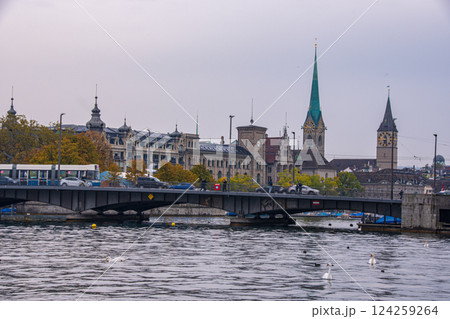 チューリッヒ湖畔に広がるチューリッヒの街の風景 グロスミュンスター大聖堂 スイス