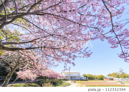 満開の桜とカラフルなチューリップが美しい春の風景《三重県・なばなの里》