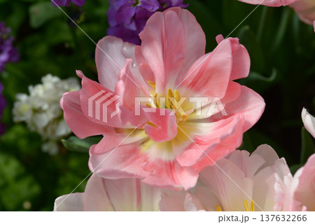 [素材] 日本製の庭園で白いデイジーに囲まれたピンクのチューリップ。