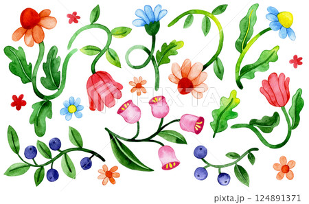 Colorful flower set. Separate isolated flowers different shapes. Yellow daffodil, pink tulip, chamomile daisy blossom. Spring floral meadow bloom. Garden herb bud field. Decorative nature plant