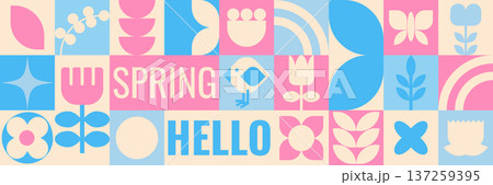 Hello Spring pastel mosaic layout featuring welcoming message and decorative elements banner