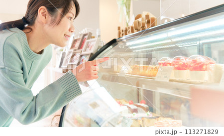ショーウィンドウ内のケーキを選ぶ若い女性
