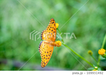 Orange-spotted butterfly in spring meadow Melithea trifle Cyriaca