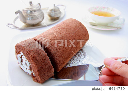 ココアロールケーキのティータイム (縦位置ハイアングル)