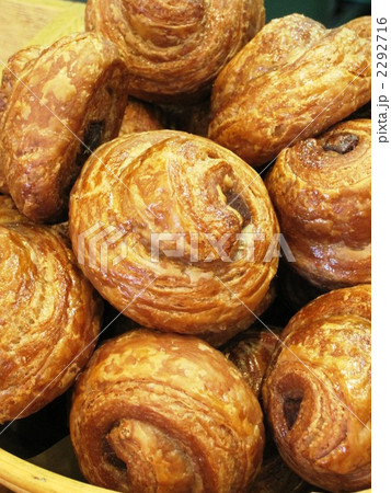 ベーカリーに並ぶシナモンロールとチョコレートがけパンの陳列