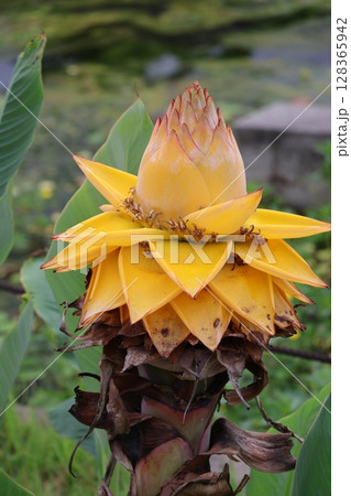 バショウ科のチヨウキンレンの苞葉と花・クローズアップ