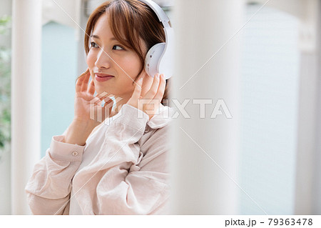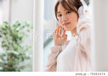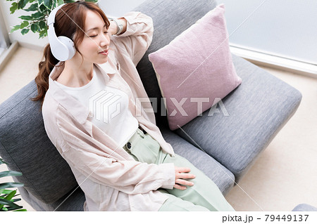 ヘッドフォンで音楽を聴きながらリラックスする若い女性