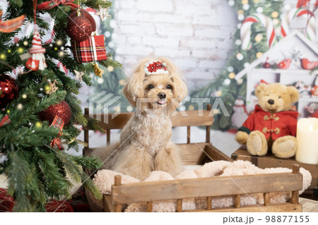 クリスマスツリーとベッドにのったチワプー
